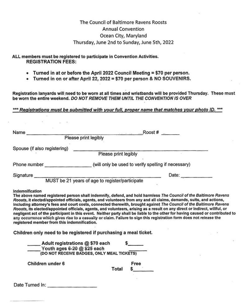 Click on the Registration Form below to download a copy. Make your check payable to Ravens Roost #115 and turn in the registration form by the April Ravens Roost meeting.