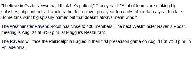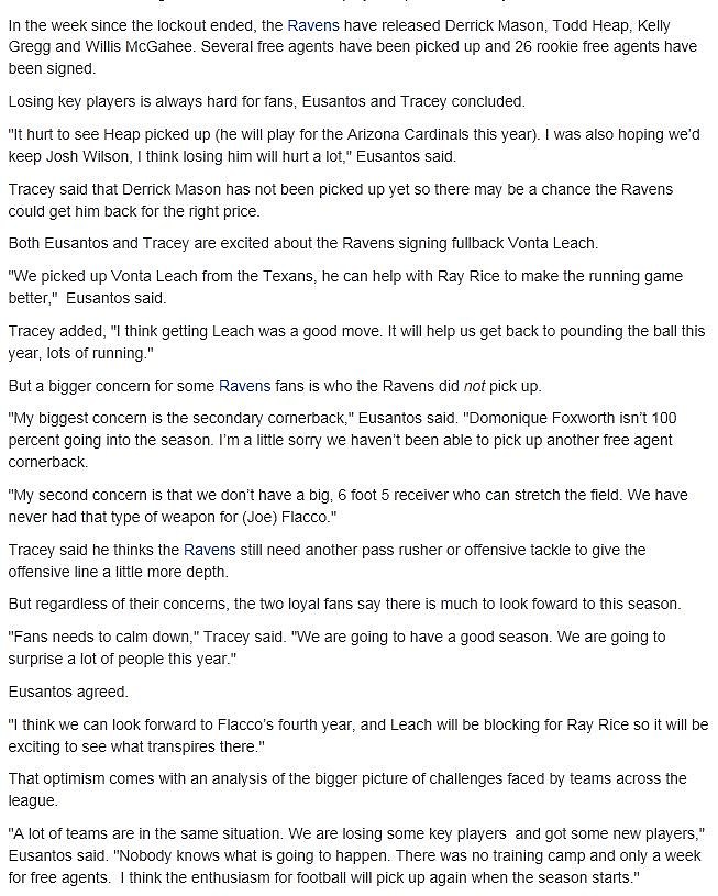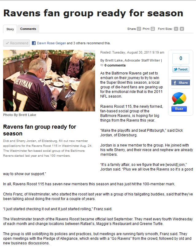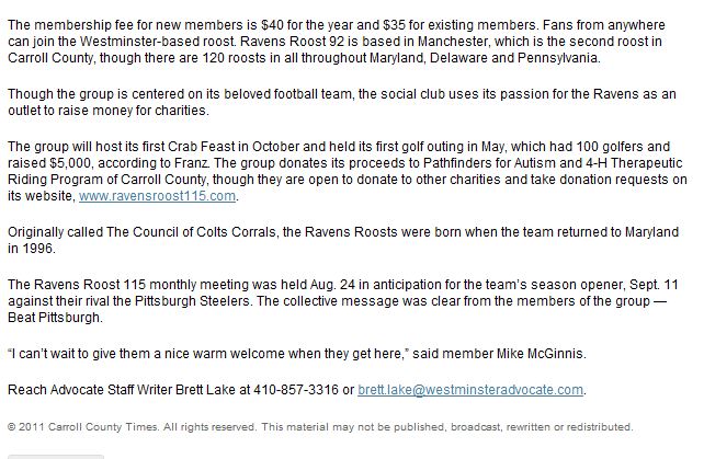 - "Ravens fan group ready for season" from The Advocate of Westminster & Finksburg, August 31, 2011