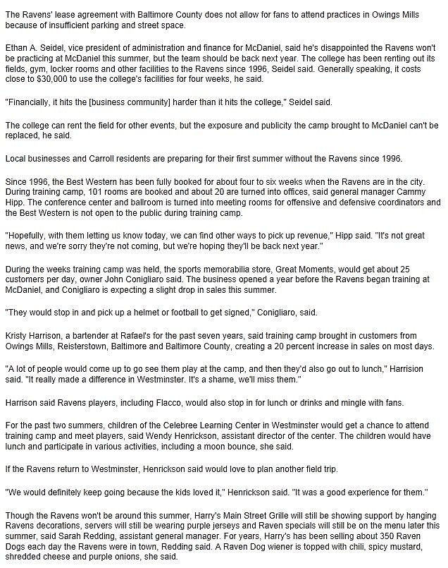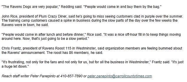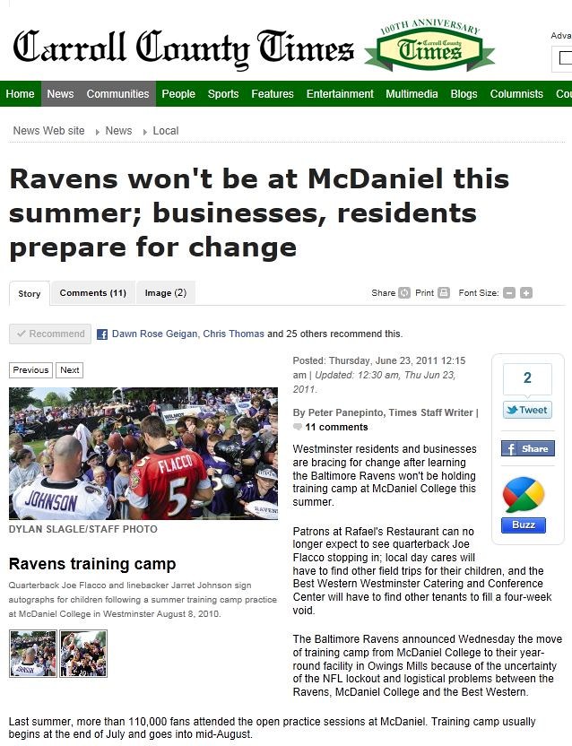 "Ravens won't be at McDaniel this summer; business, resident prepare for change" from the Carroll County Times, June 23, 2011