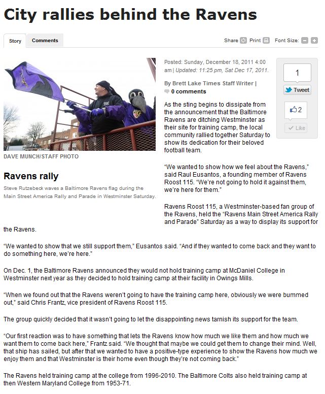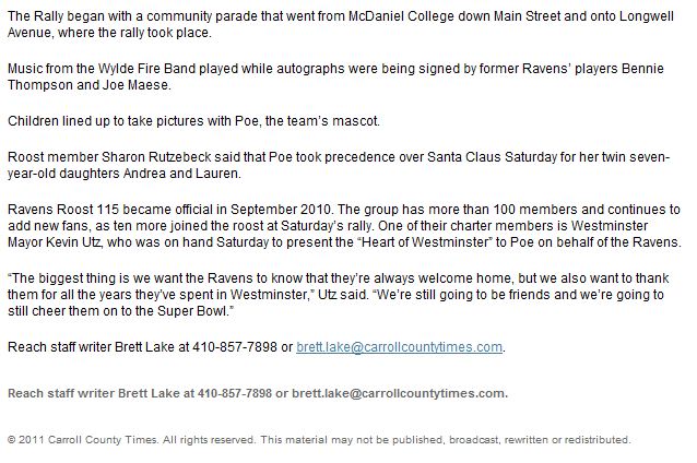 - "City rallies behind the Ravens" from the Carroll County Times, December 18, 2011