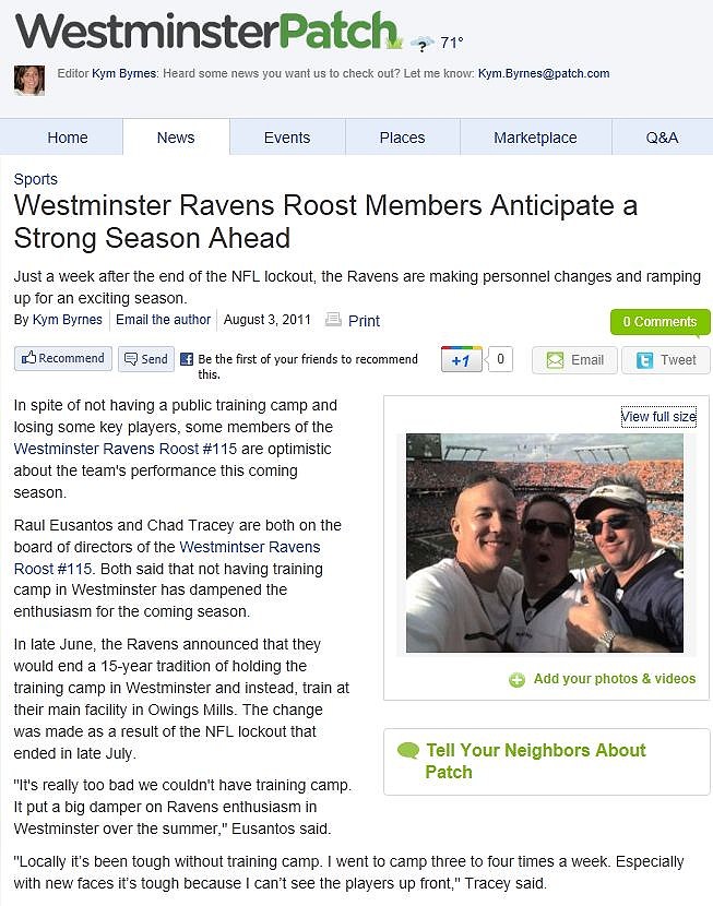 - "Westminster Ravens Roost Members Anticipate a Strong Season Ahead" from the Westminster Patch, August 3, 2011
